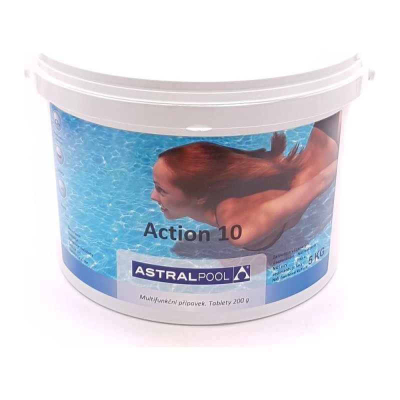 Prvotné dávkovanie: po dosiahnutí hodnoty voľného chlóru 0,6 g / m3 rychlorozpustným organickým chlórom aplikujte 1 tabletu (200g) Action-10 na každých 20 m3 objemu vody v bazéne.